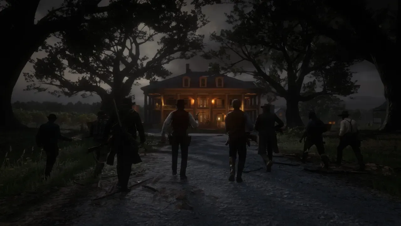 La primera vez que crucé el camino que lleva a la mansión Braithwaite en Red Dead Redemption 2, rodeado de robles centenarios alineados como columnas naturales formando una bóveda vegetal sobre nuestras cabezas, con la percusión de la banda sonora retumbando en las tripas y los compañeros de la banda caminando a mis costados en una formación que se iba estrechando a medida que la mansión aparecía al fondo envuelta en la penumbra del atardecer, experimenté algo que no me había sucedido nunca en un videojuego. No fue admiración técnica, ni el cosquilleo habitual del espectáculo bien ejecutado, ni siquiera esa satisfacción del jugador curtido que reconoce un momento de diseño especialmente inspirado. Fue algo más primitivo y más difícil de explicar: la sensación de estar en un sitio. No de verlo, no de jugarlo, no de contemplar una representación más o menos lograda de un paisaje sureño. De estar ahí, con el olor a tierra húmeda y a pólvora que uno se inventaba solo porque el juego había hecho todo lo demás tan bien que la imaginación se encargaba de rellenar lo que faltaba.